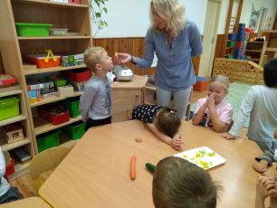 Motýlci poznávají zeleninu ( 26.-30.9.), tiskají "mrkev pomocí mrkve, z krepového papíru hrášek, modelují, "sázejí mrkev do písku, krájí brambory na korále , zahráli jsme si pohádku "O veliké řepě", a hlavně jsme si užili ochutnávku zeleniny se zavázanýma očima a poznávali podle čichu a chuti.