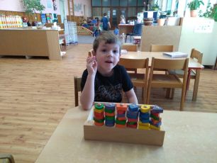 Děti poznávají barvy, tvary, počítají do 10, malují vodovými barvami "pastelky", vkládají korálky do lahviček pomocí pinzety..