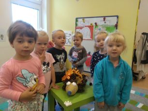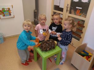 Šnečci si vytvořili ježka Bodlinku ze šišek, které si nasbírali.