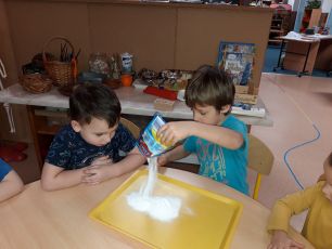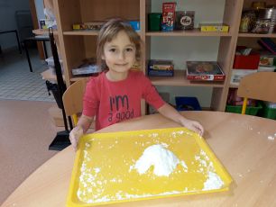 Snížek nepadá, a tak zkoušíme vyrobit umělý sníh z jedlé sody a kondicionéru. Děti byly nadšené a moc je to bavilo... (17.1.2022)