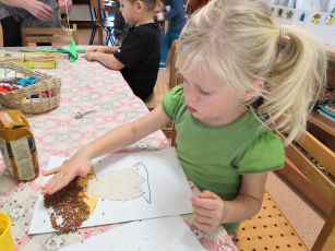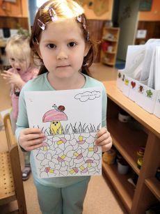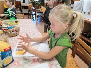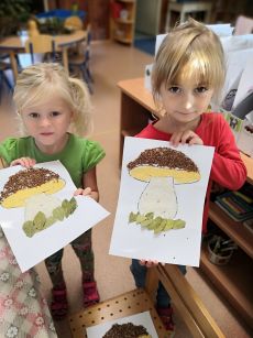 Nádherná práce při výrobě hříbků z potravin jako je pohanka, jáhly,rýže a bobkový list. I v pacovním listě děti hledaly houby, "najdi a vymaluj všechny houby a spočítej je". Třídní učitelka Kateřina Brabcová