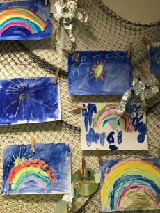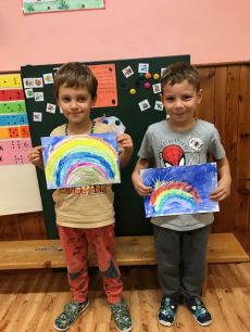 Hry s barevnými víčky- přiřazování do tvaru mraku a sluníčka, Sudoku , pokus s barvou a voskovými pastely - Duha. Třídní učitelka - Lenka Pecková