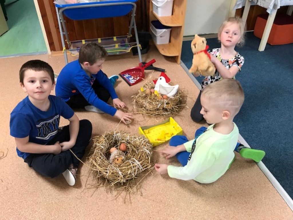 Na tom našem dvoře, všechno tam krákoře. Děti si vytvořily kurník pro slepičky a kuřátka, velkým zážitkem pro ně bylo dojení mléka. (11.-14.4.2023)