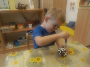 Šnečci barvili šišky bílou temperou na vánoční jarmark.
