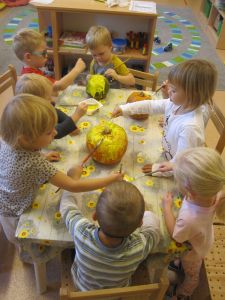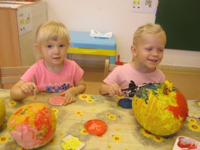 Děti vykouzlily pomocí barviček usměvavé dýně. Učitelka Vlaďka