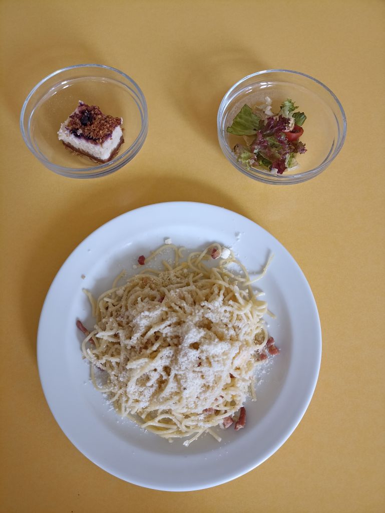 Oběd č.1: Špagety Carbonara, zahradní salát s mozzarellou