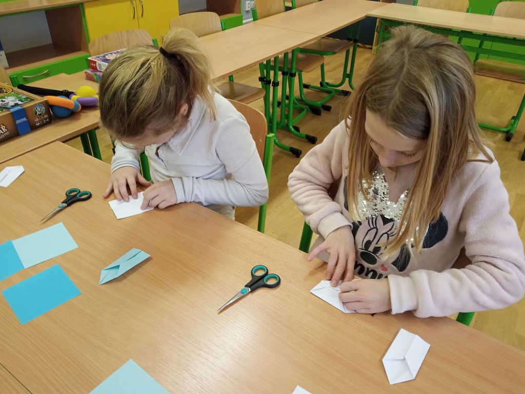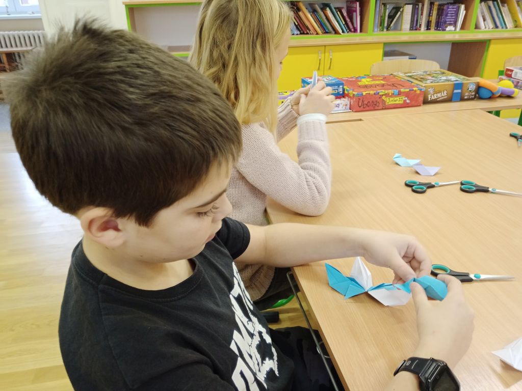 Děti využily svých zkušeností se skládáním origami a vytvořily barevně sladěné vánoční hvězdy. Poté stačilo poprosit šikovného pana školníka, aby nám z kartonu vyřízl strom a hvězdy na něj nalepit. Stromek se stal pěknou dekorací ve školní družině a navíc – určitě nám do Vánoc neopadá!