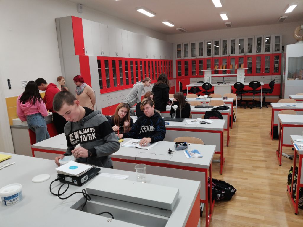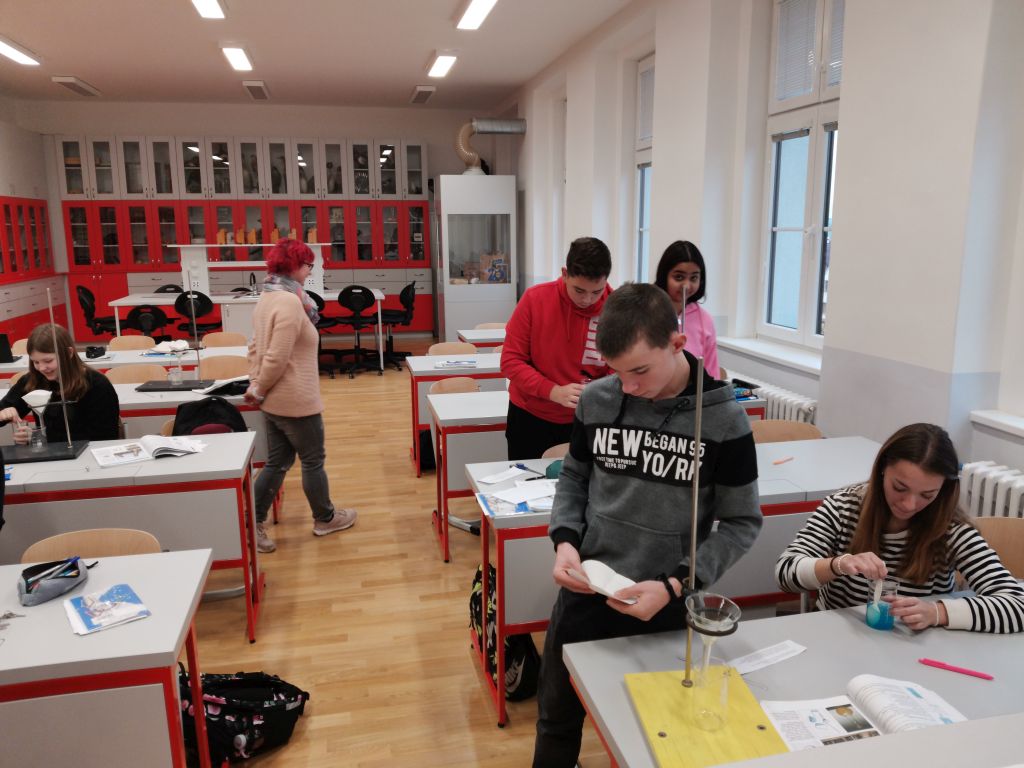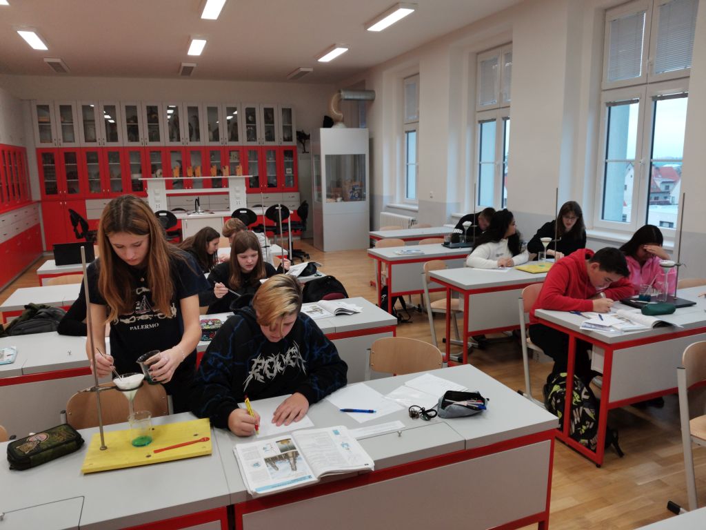 Jak se pracuje v chemické laboratoři si v pondělí 13. listopadu vyzkoušeli osmáci, kteří mají prvním rokem chemii. Filtrace se jim docela povedla, na výsledky krystalizace ještě čekáme… Jiří Rejsek