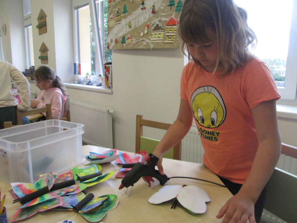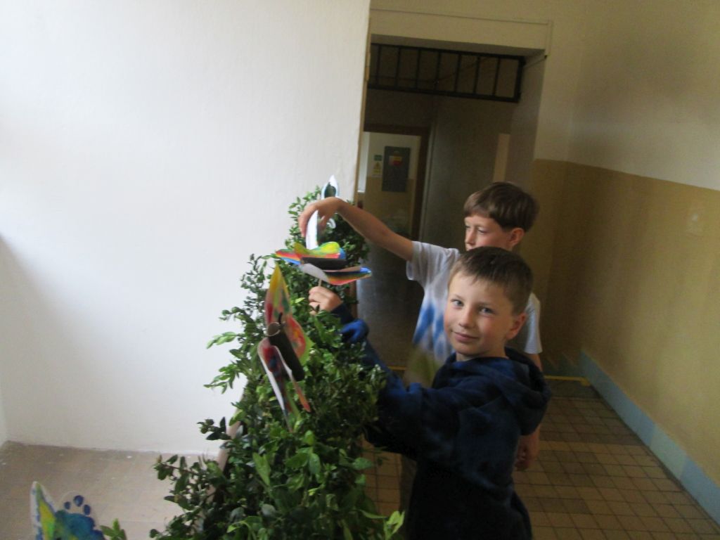 Technikou symetrického otiskování barev děti vytvořily veselé motýlky, které jsme použili k dekoraci truhlíků do školní jídelny. Ilona Sedláčková a Irena Švábenská