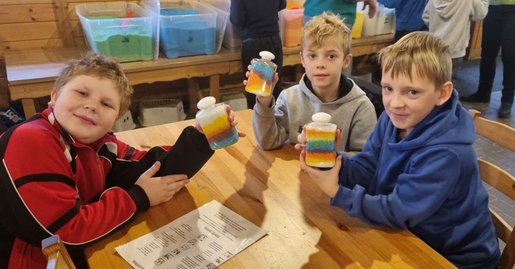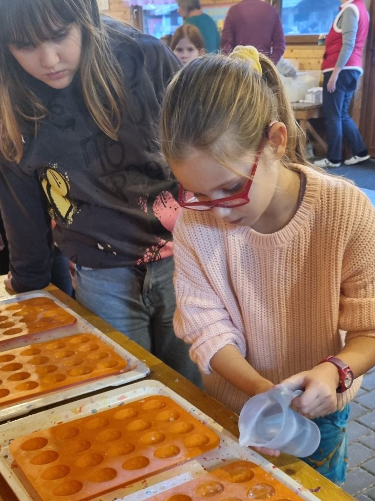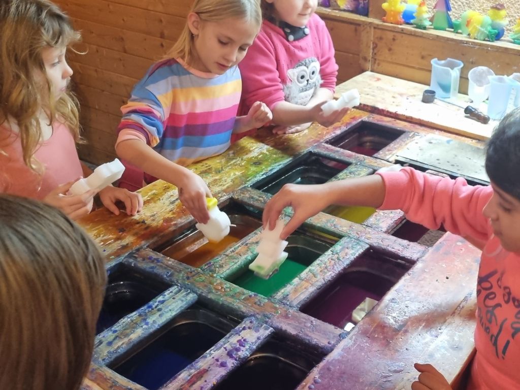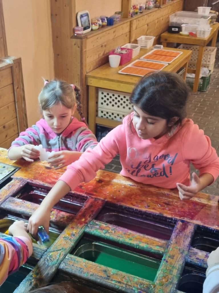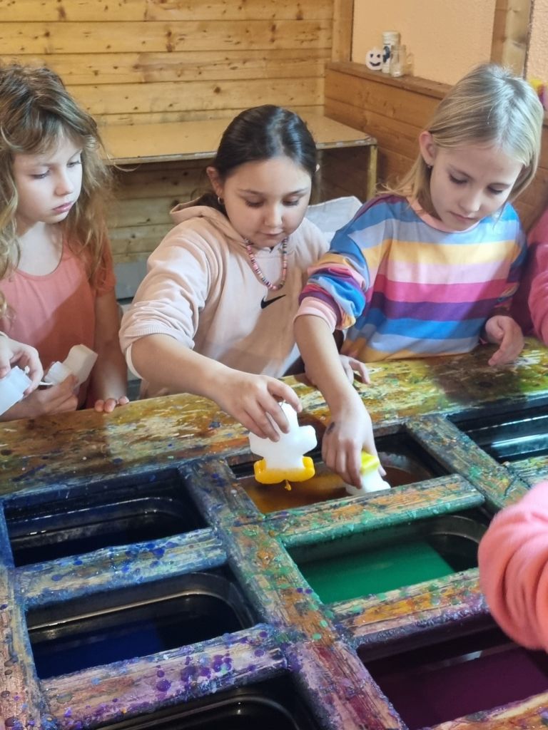 V dílničce provoněné éterickými oleji jsme si namíchali barevnou mořskou sůl s ozdravnými účinky, a poté nás čekalo namáčení svíček do barevných vosků.