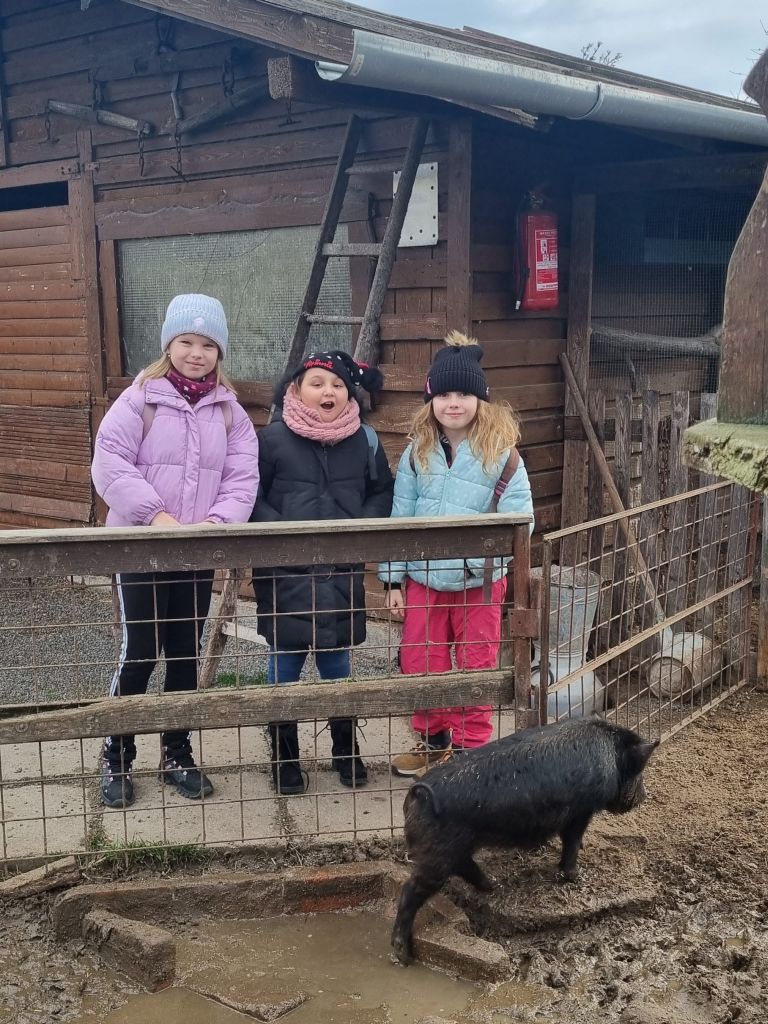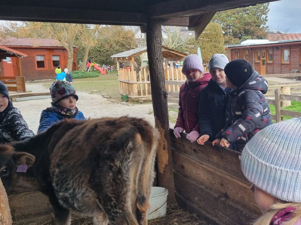 V areálu jsme měli možnost zblízka si prohlédnout místní hospodářská zvířata (některá dokonce i pohladit), a po svačině nás čekala zábava ve vnitřní části.