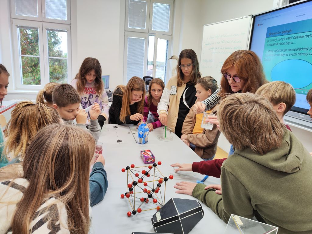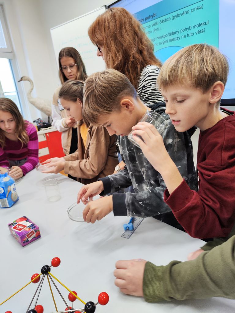 Proběhla hodina plná pokusů a pozorování na téma částice, atomy a molekuly. Formou difúze: voda po vnoření sáčku s čajem se zbarví rychleji v teplé vodě než ve vodě studené. Mgr. Markéta Drobečková Kateřina Brabcová