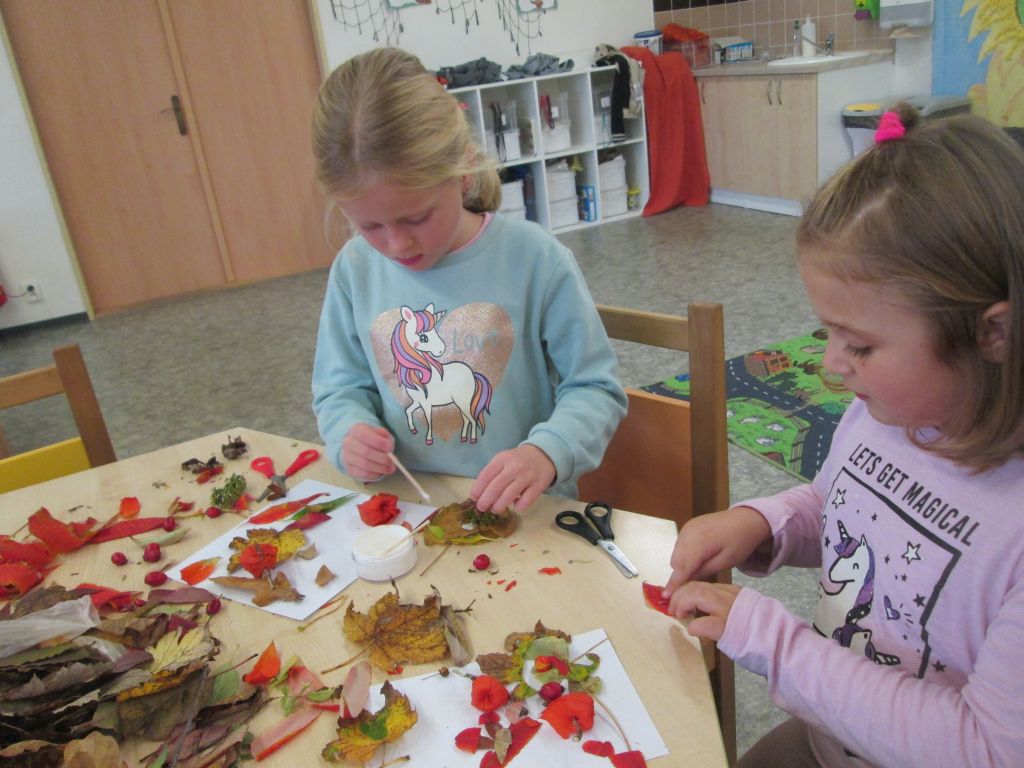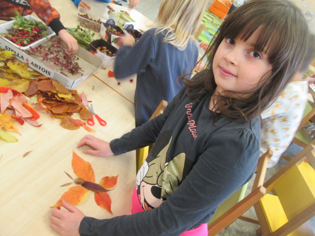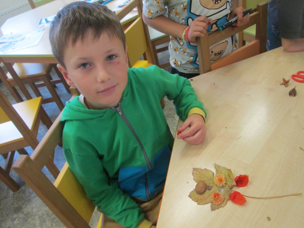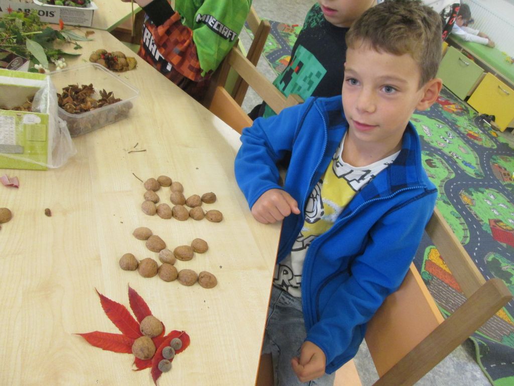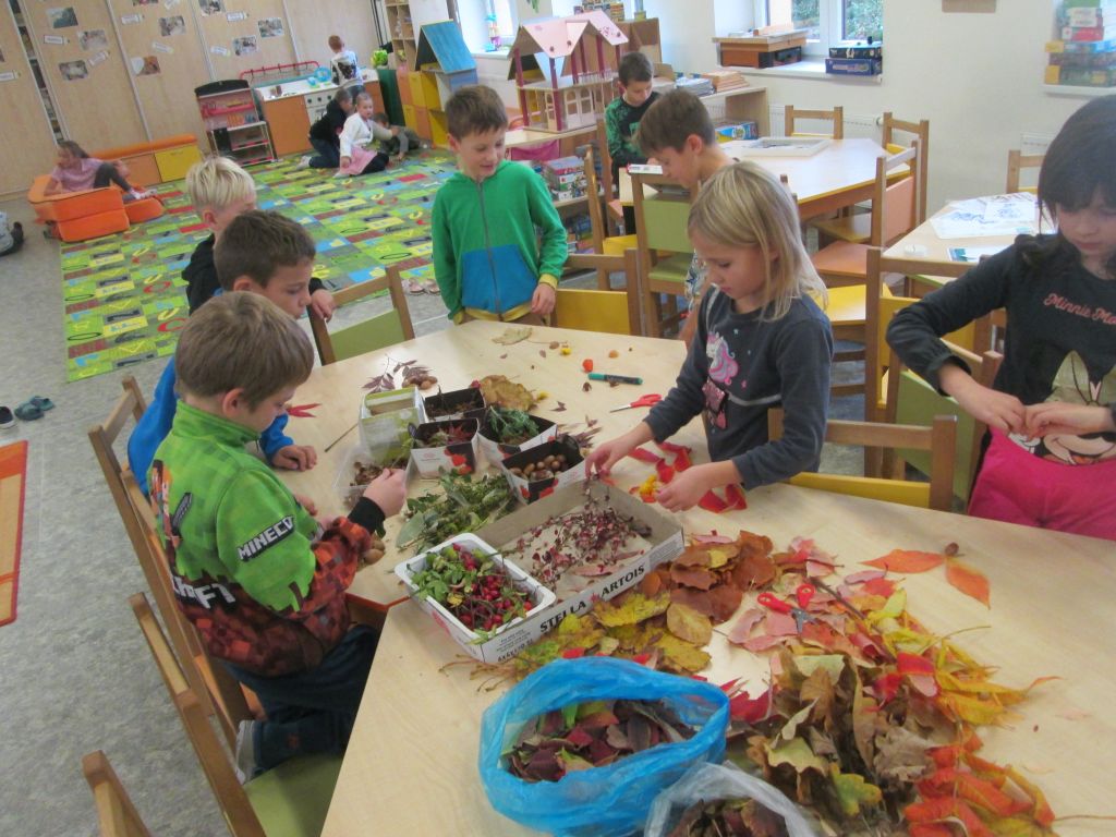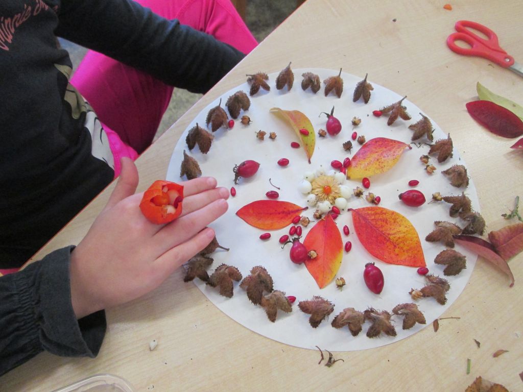 Příroda právě nabízí spoustu krásně zbarvených listů a plodů, které jsme využili nejprve ke Kimově hře (poznávačka) a pak jsme k rozvoji fantazie. Děti si z tohoto materiálu poskládaly obrázky, zvířátka, mandaly a jiné pěkné dekorace.
