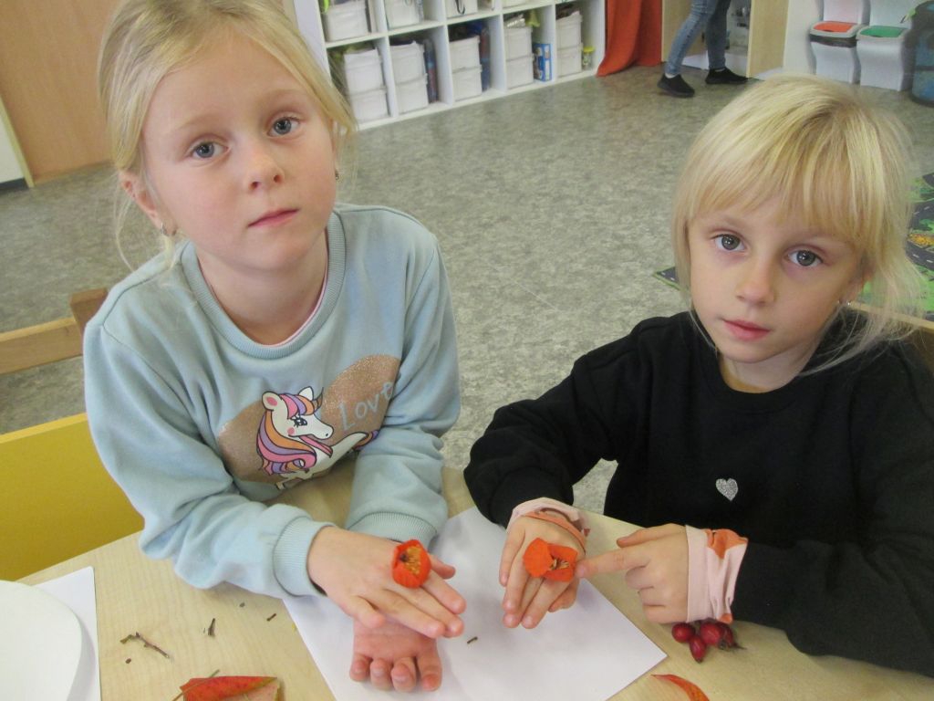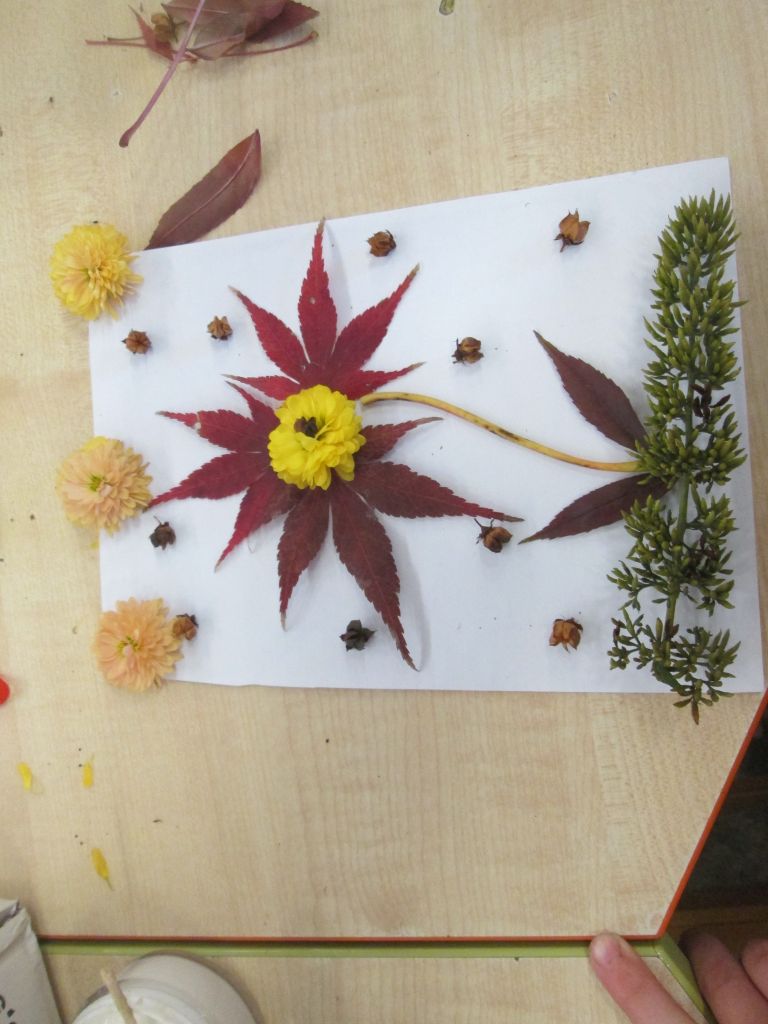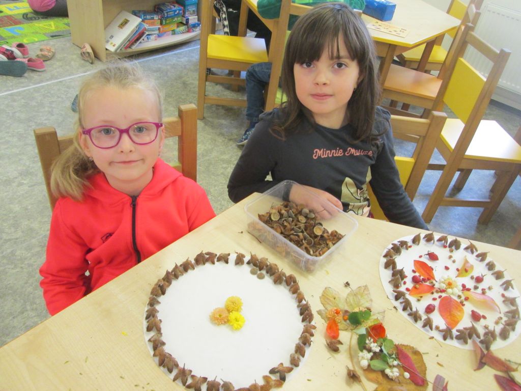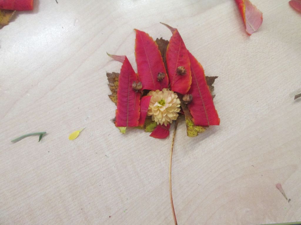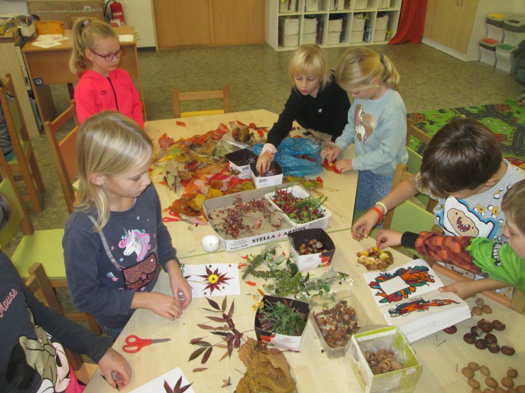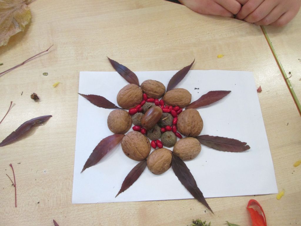 Příroda právě nabízí spoustu krásně zbarvených listů a plodů, které jsme využili nejprve ke Kimově hře (poznávačka) a pak jsme k rozvoji fantazie. Děti si z tohoto materiálu poskládaly obrázky, zvířátka, mandaly a jiné pěkné dekorace.
