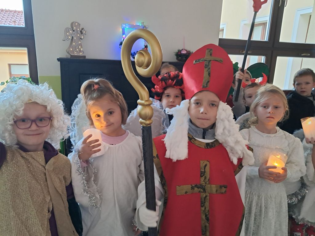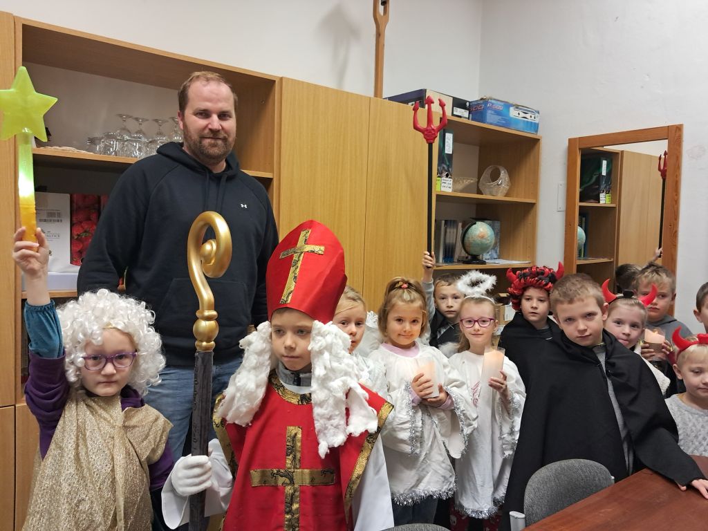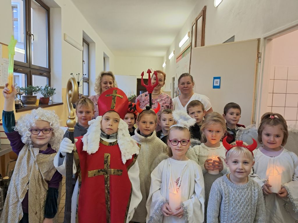 Dnes se žáci 1. třídy proměnili v Mikuláše, anděly, čerty a šli se projít po naší škole