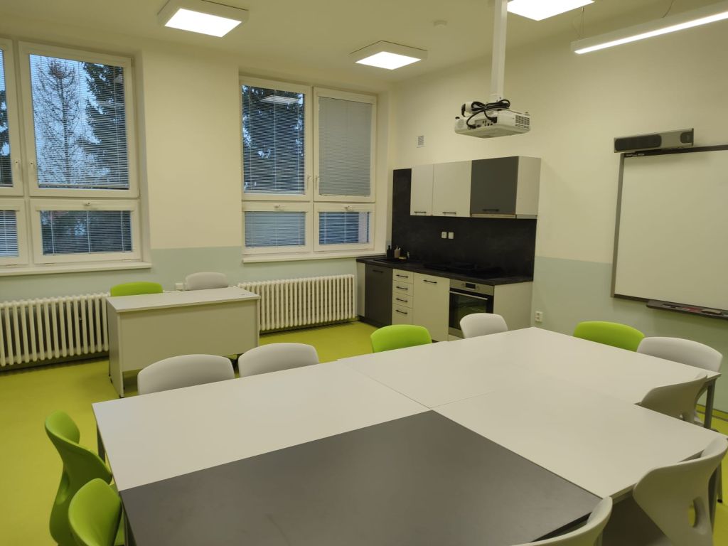 A když se nevaří? Kuchyňka se jednoduše promění v plnohodnotnou učebnu s projektorem, tabulí a dostatkem pracovních míst pro žáky.