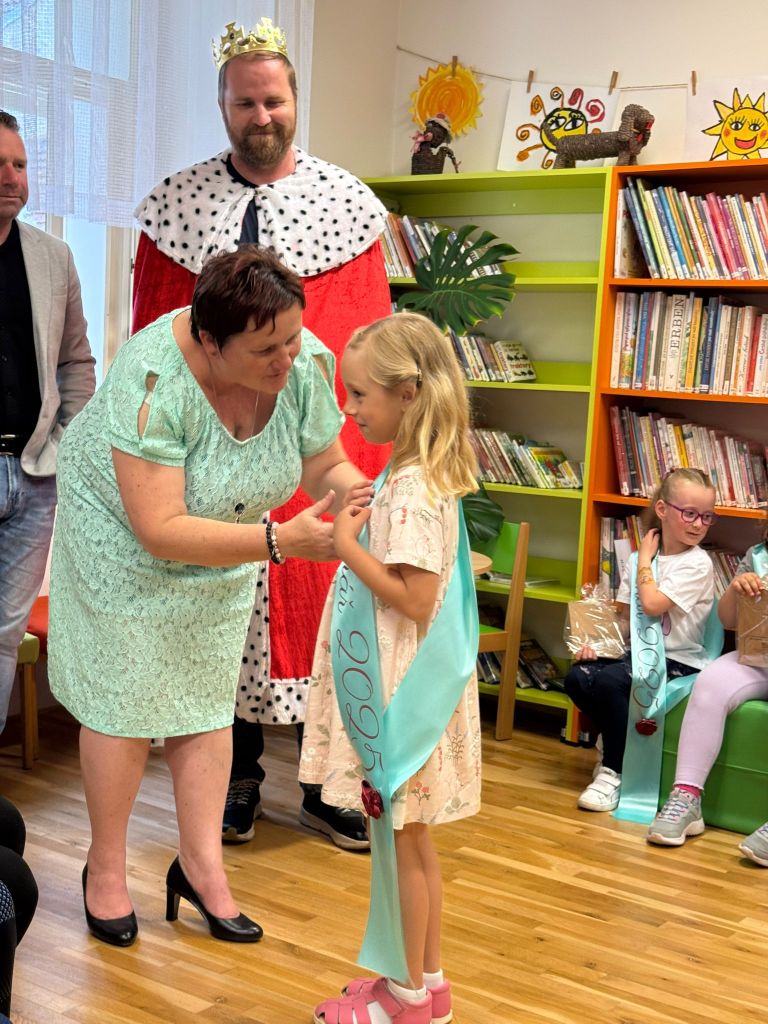 Poté už přišel slavnostní okamžik – vznešený král Abecedník I. každého prvňáčka pasoval na čtenáře. Děti si odnesly šerpu, malý dáreček a také průkazku do knihovny, aby mohly v trénování čtení pokračovat.