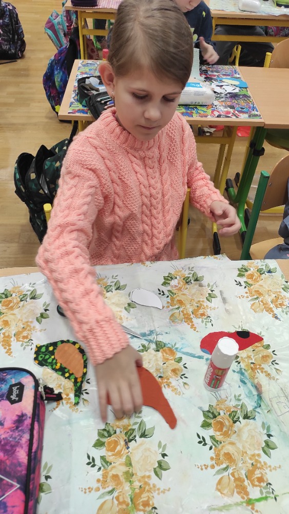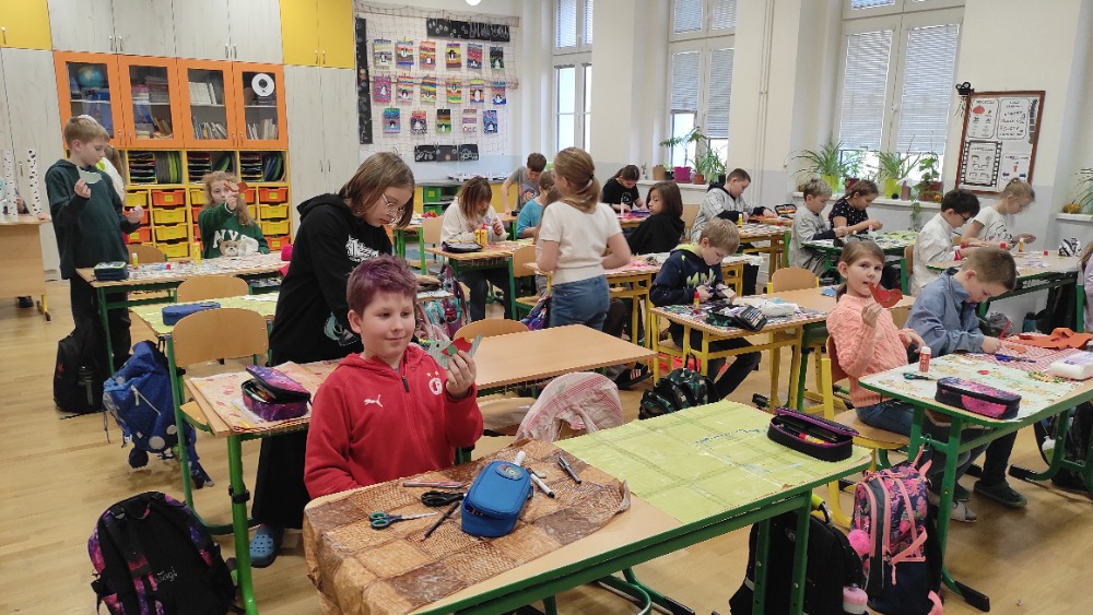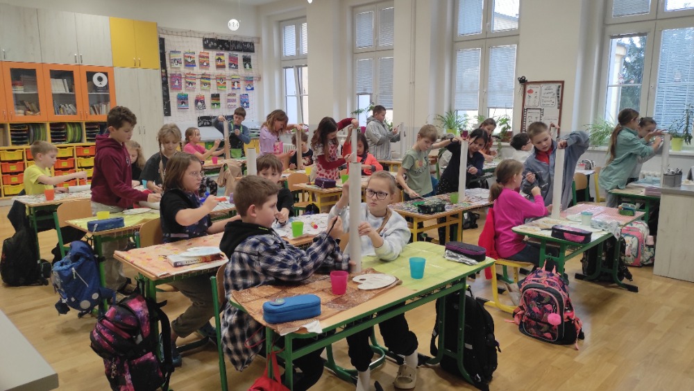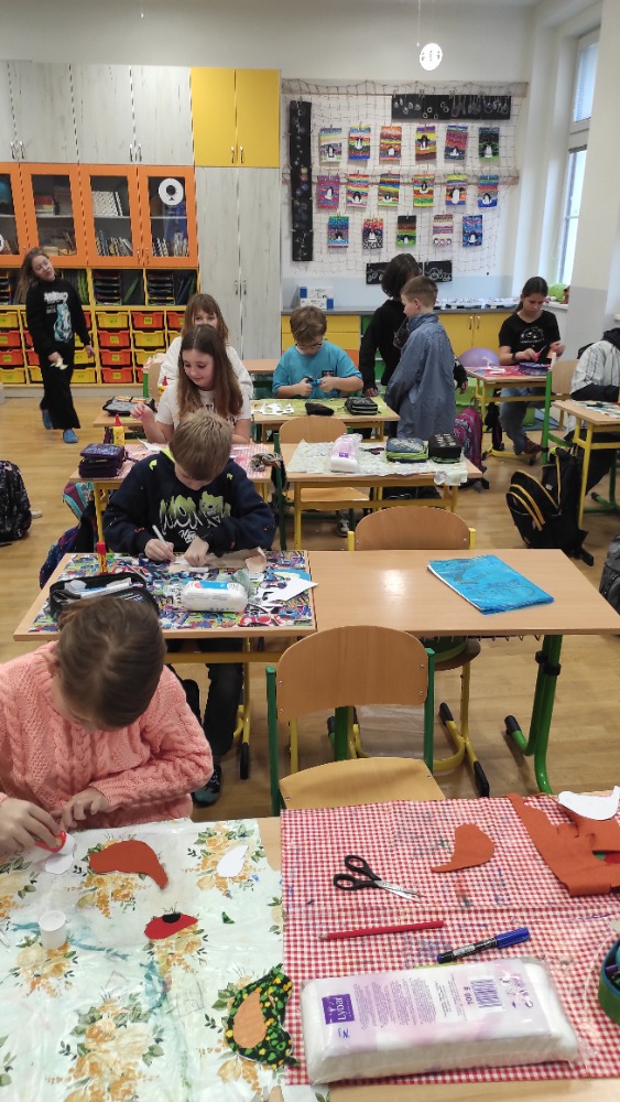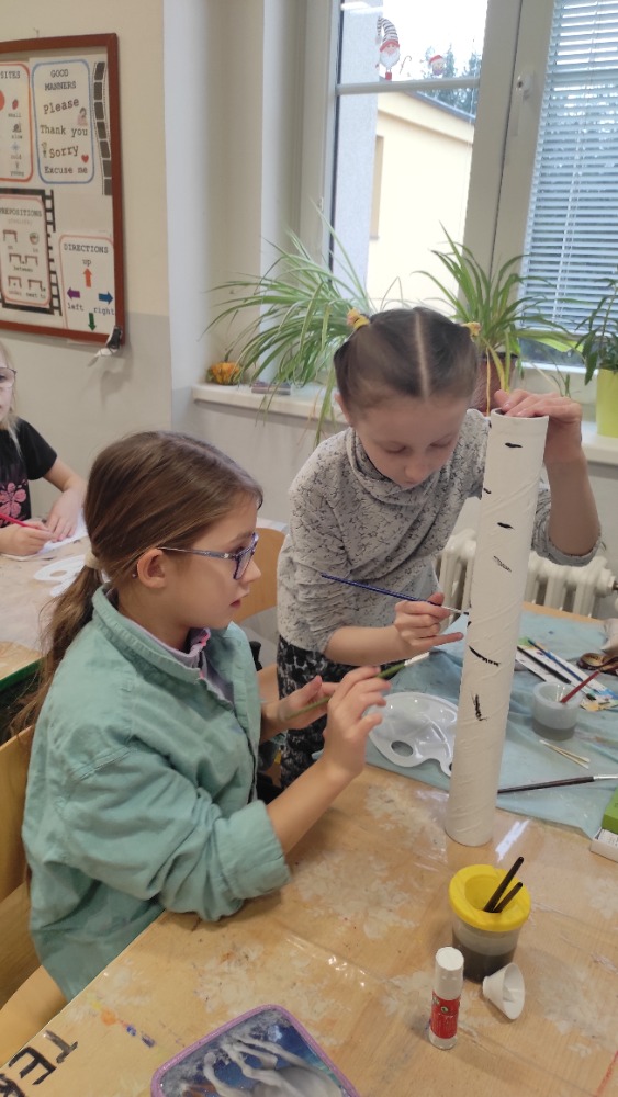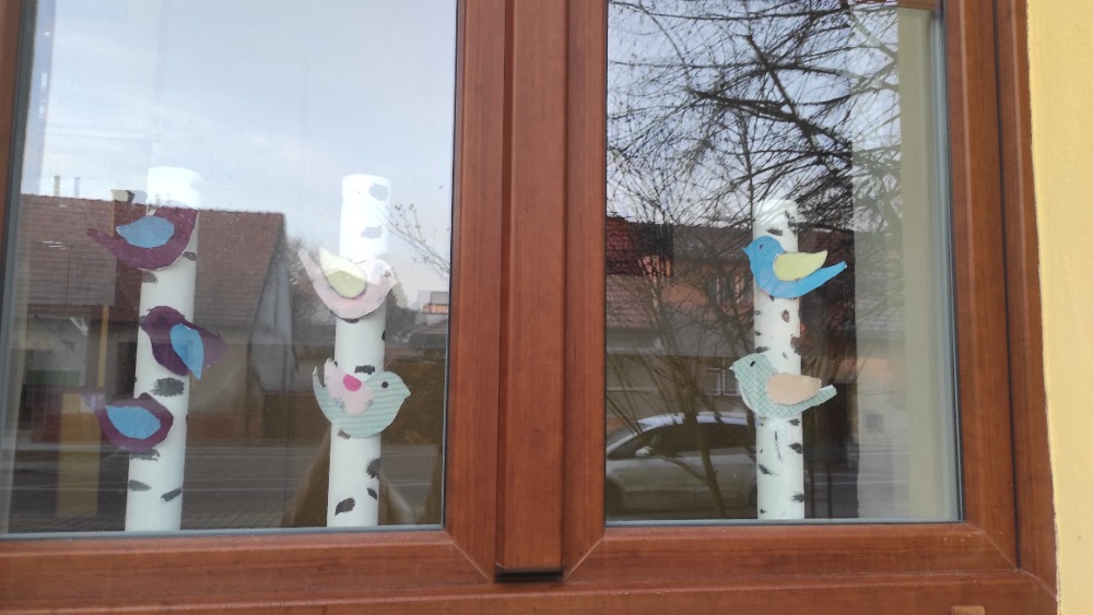 Žáci čtvrté třídy vytvářeli v hodinách praktických činností les, ve kterém rostou břízy a na jejich větvičky si sedají ptáčci a krásně zpívají. Mgr. Dagmar Fišlová