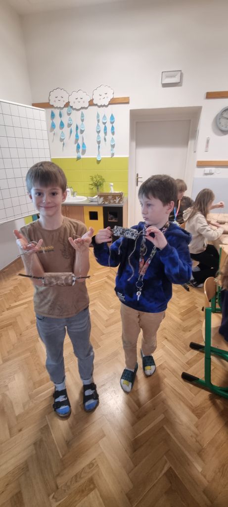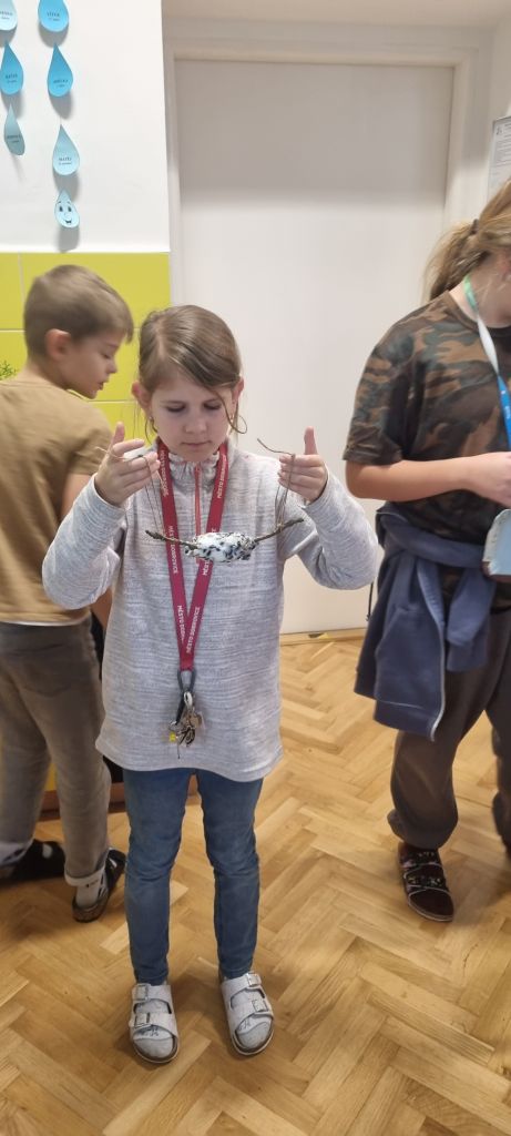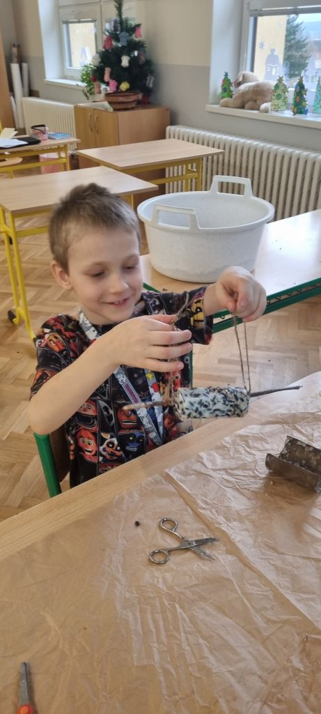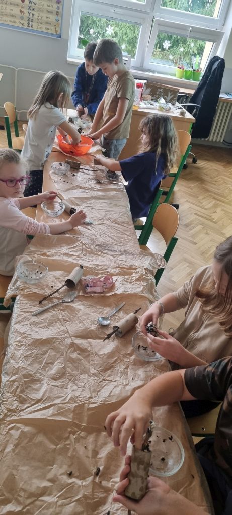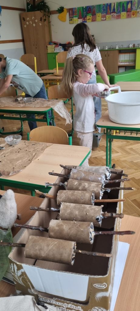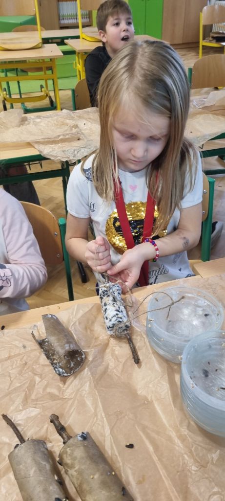 Špalíčky jsme vyvěsili během vycházky s družinou a po zahradě školy. Zpět jsme se vraceli s dobrým pocitem z pomoci přírodě a těšíme se, že budeme mít možnost pozorovat hodující ptáky.