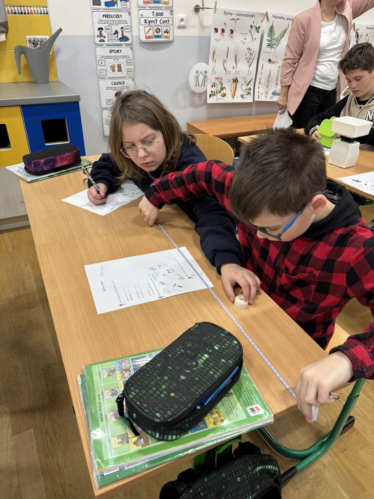 Měříme a vážíme nejen sebe, ale i věci kolem nás. Tipujeme kolik co váží a pak si naše odhady ověřujeme. Na závěr se žáci pochlubili měřidly, které doma běžně používají a dokonce někteří donesli poklady z půdy.