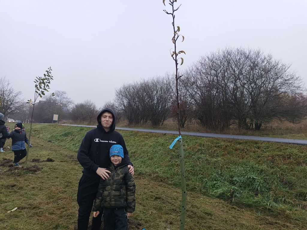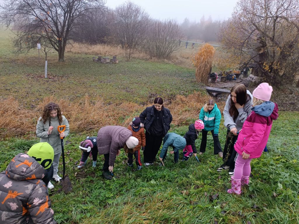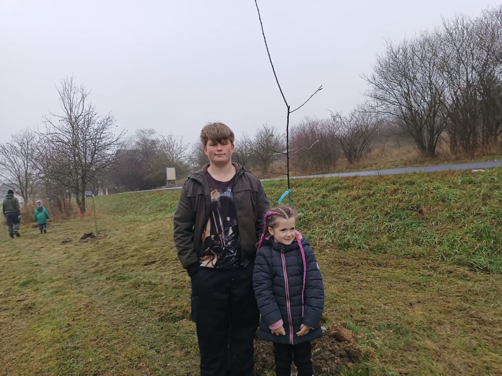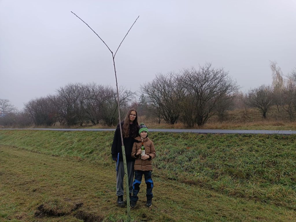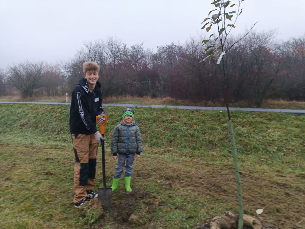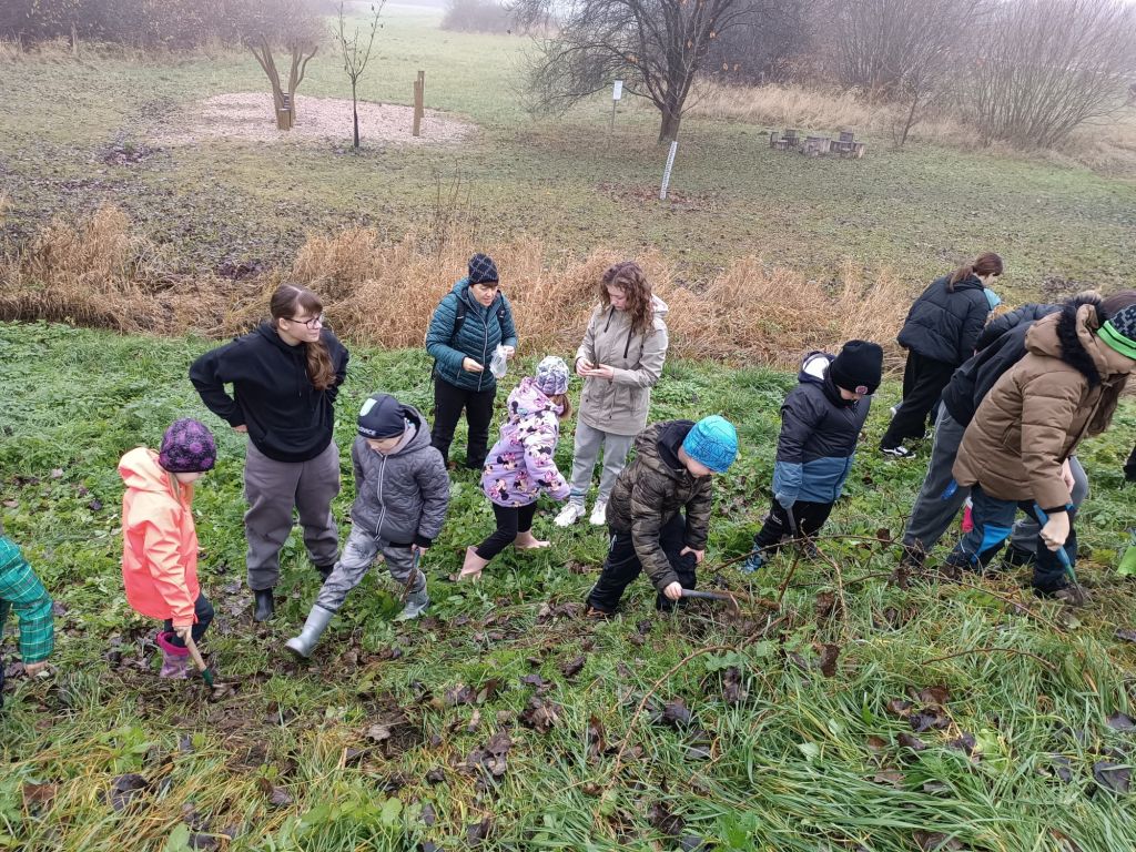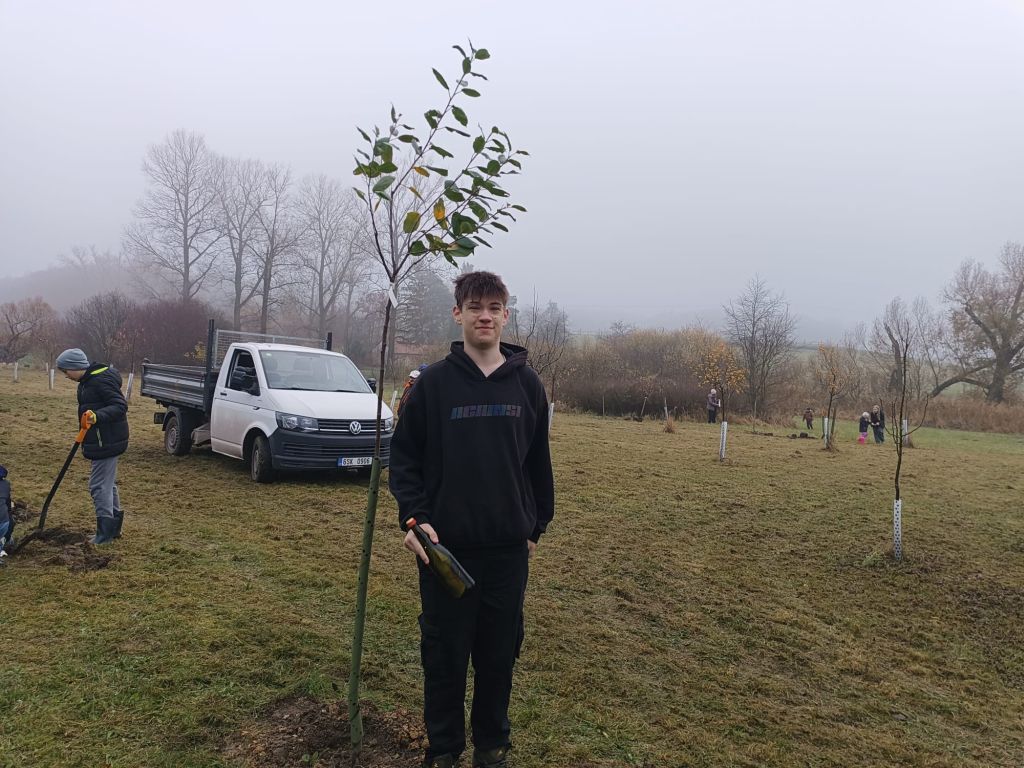 Po společné svačině – horkém čaji a jablečné buchtě od našich úžasných paní kuchařek – přišel nejdojemnější okamžik: každý deváťák s prvňáčkem společně zahrabali lahev u svého stromu. Byl to symbol přátelství, předávání zkušeností a naděje, že jejich stromy i vzpomínky porostou a budou tu i pro další generace.