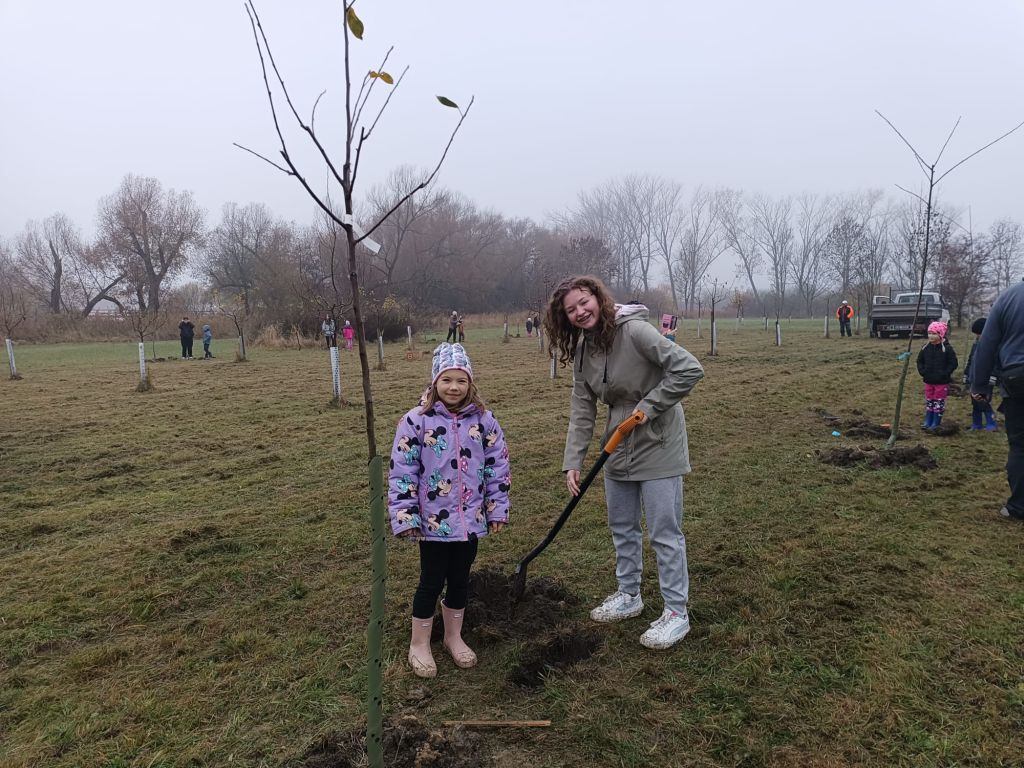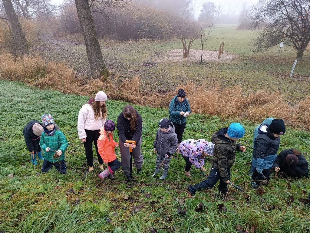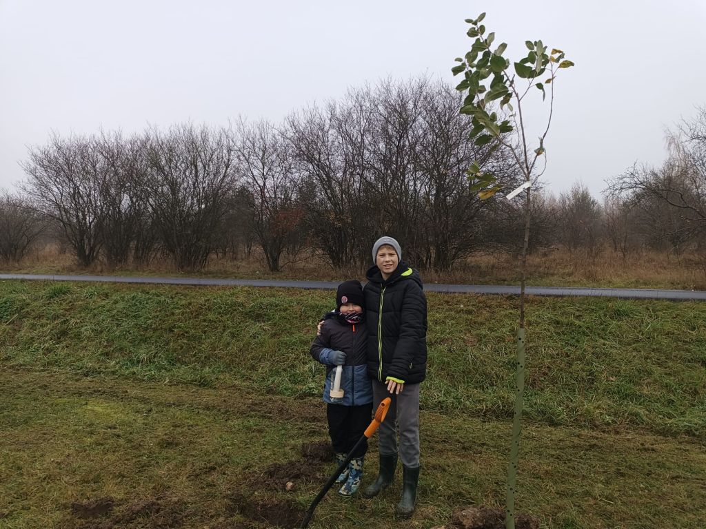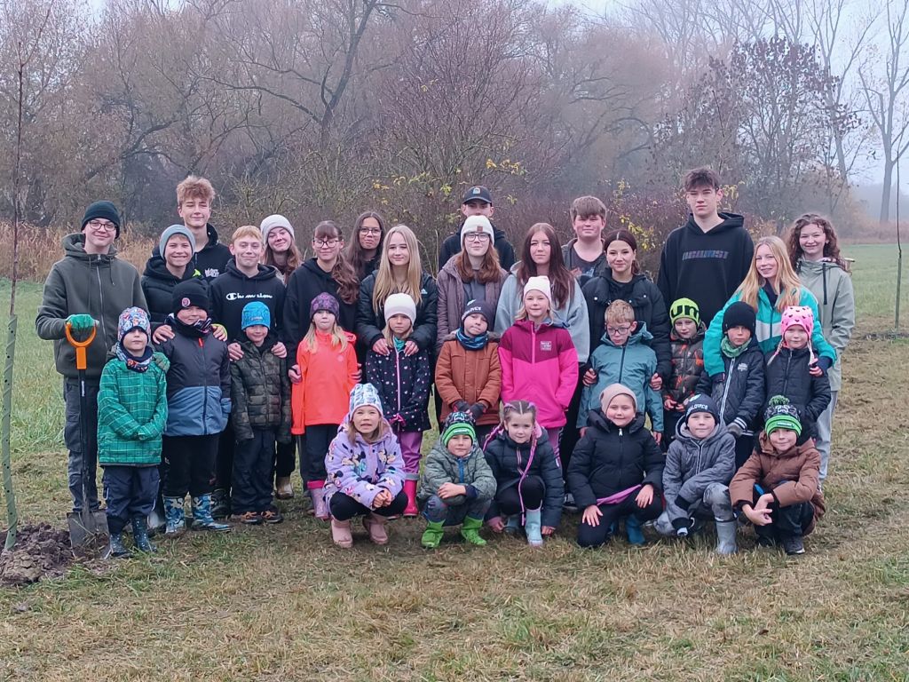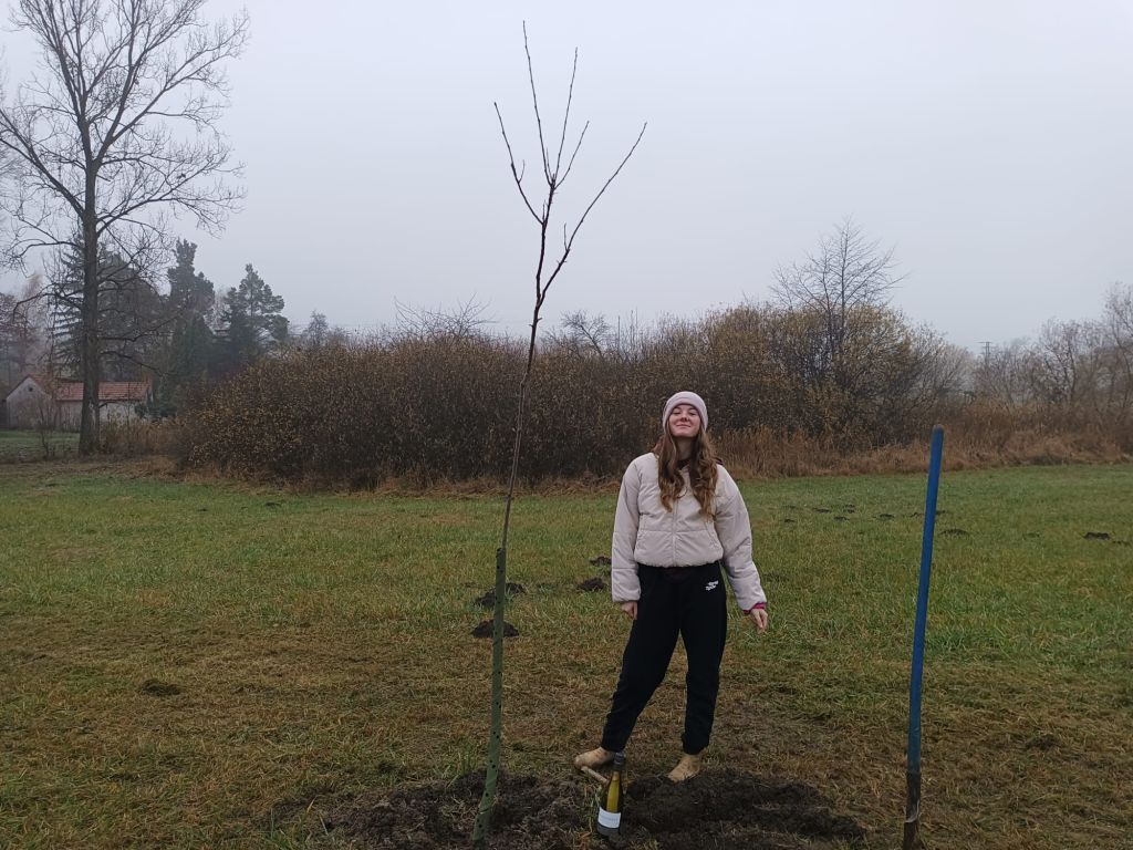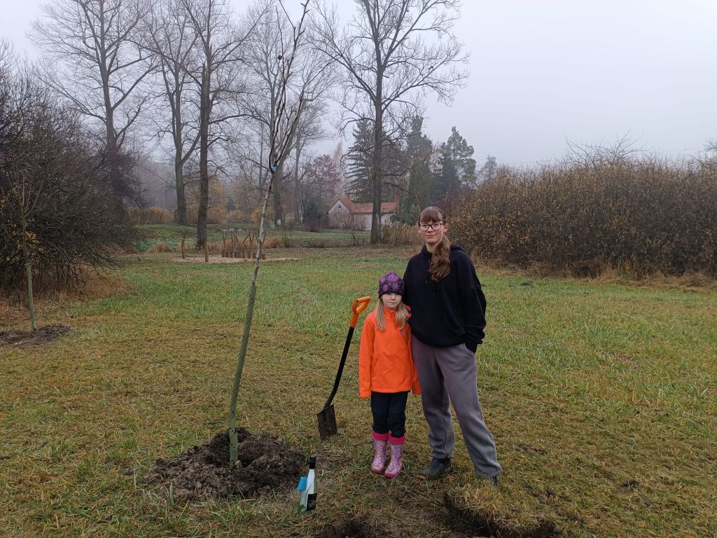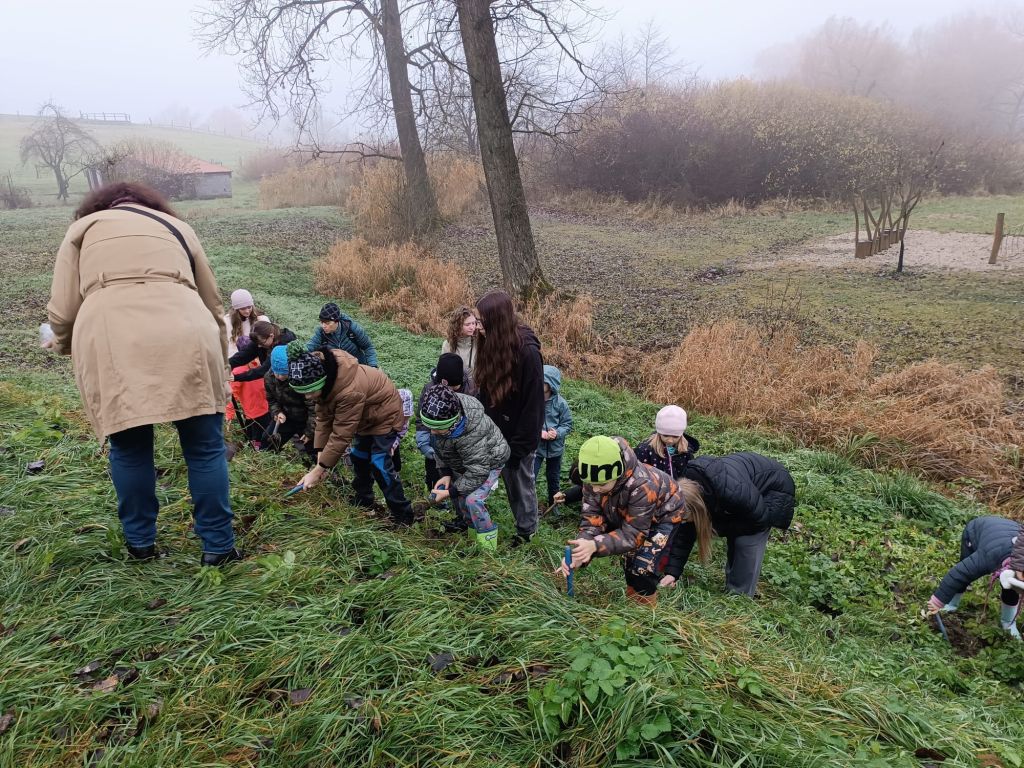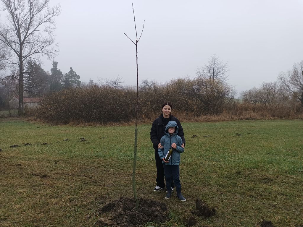 Po společné svačině – horkém čaji a jablečné buchtě od našich úžasných paní kuchařek – přišel nejdojemnější okamžik: každý deváťák s prvňáčkem společně zahrabali lahev u svého stromu. Byl to symbol přátelství, předávání zkušeností a naděje, že jejich stromy i vzpomínky porostou a budou tu i pro další generace.