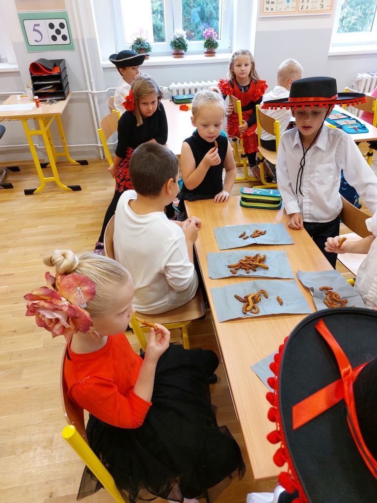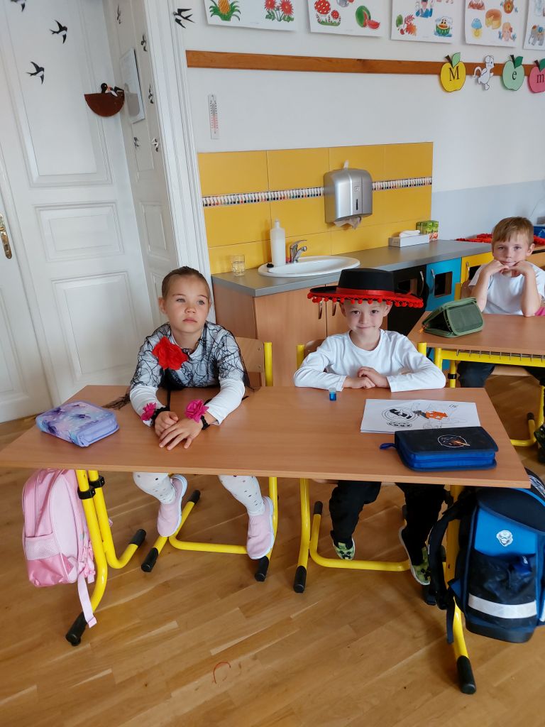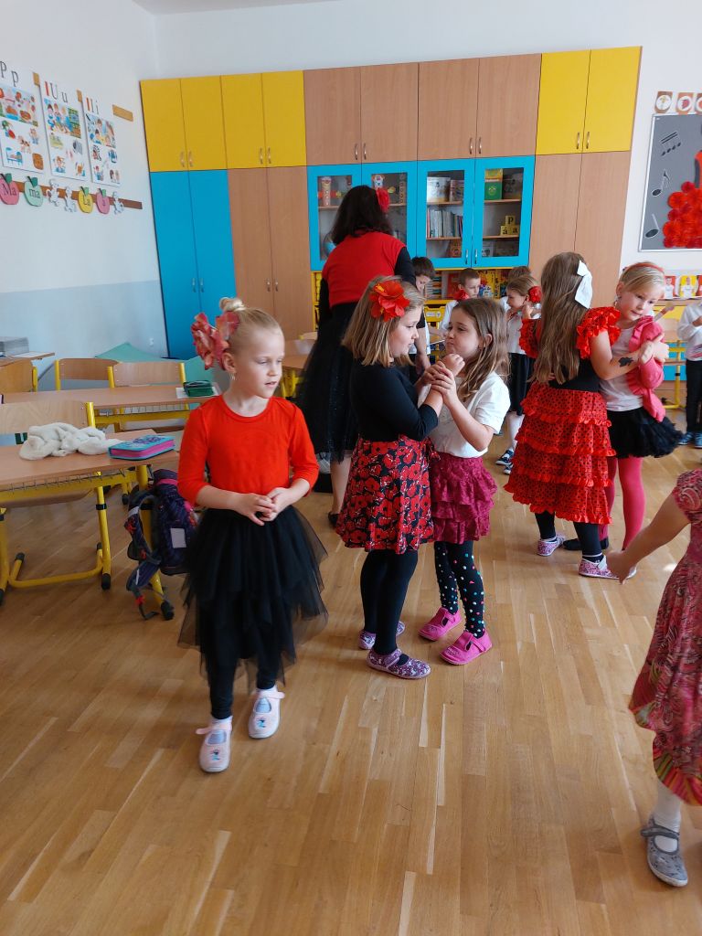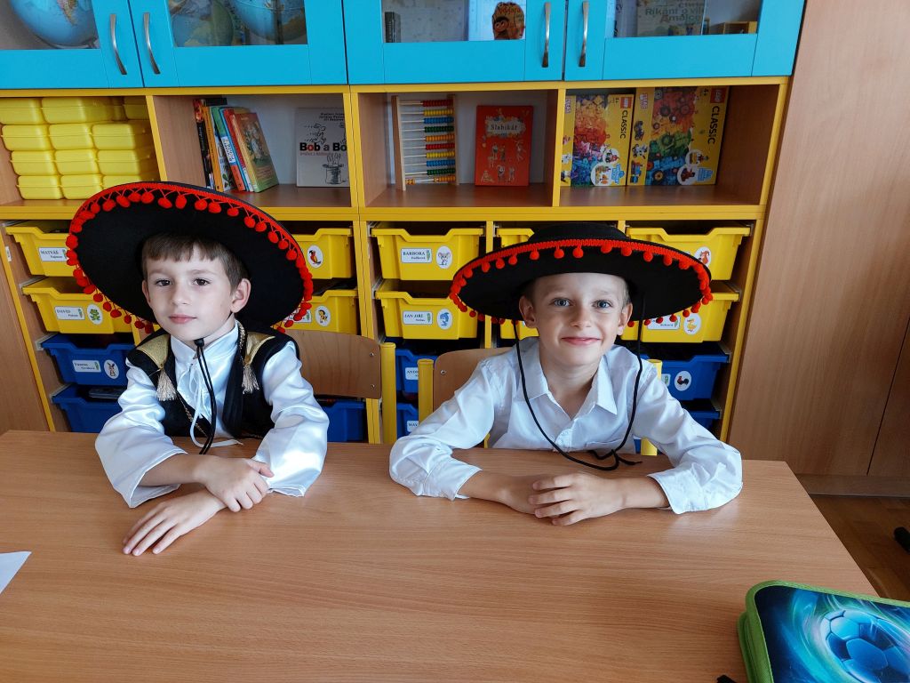 Evropský den jazyků jsme v 1. třídě oslavili cestou do Španělska. Děti přišly do školy v krásných španělských oblecích a šatech.