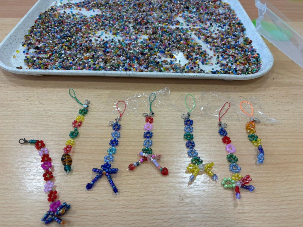 Zručné ručičky první skupiny se naučily tvořit kytičky z korálků. Druhá skupina zúročila své dosavadní zkušenosti a kytičky doplnila mašličkou jako závěrečný detail.