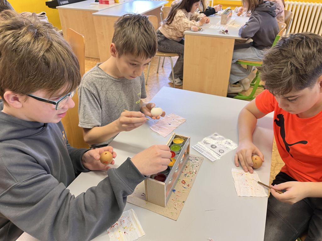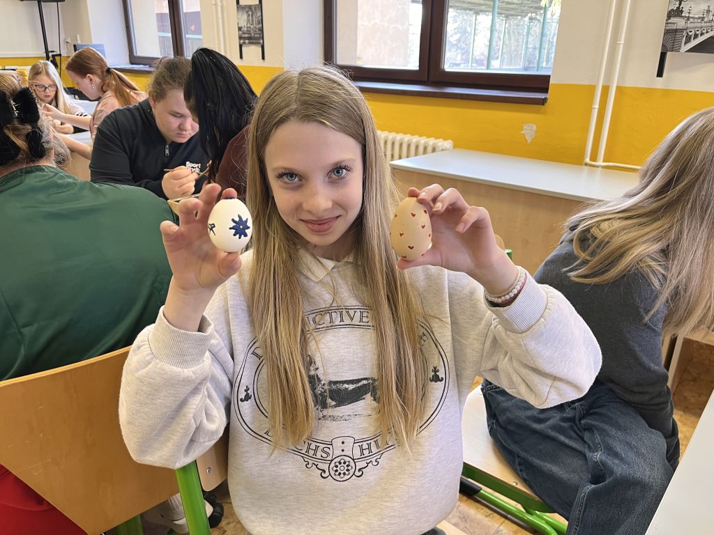 Šesťáci si nejdříve došli pro inspiraci do Galerie Melantrich, kde probíhá velikonoční výstava. Pak se ve škole pod vedením autorky výstavy pokusili vytvořit stejně krásná, voskem malovaná vajíčka. Někdy zůstalo opravdu jen u pokusu, ale některé výtvory by klidně mohly putovat na výstavu.